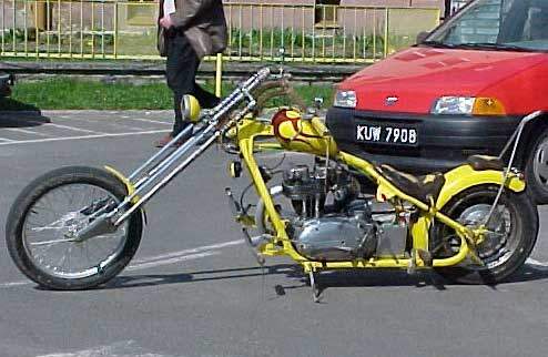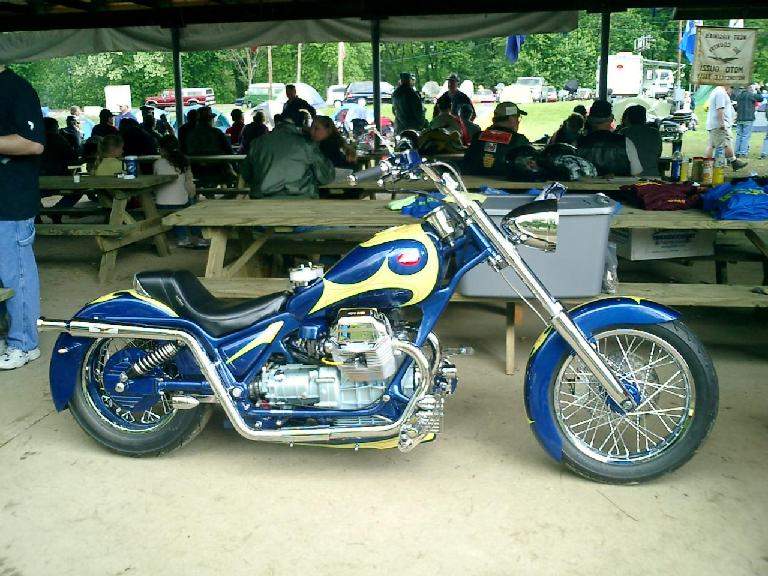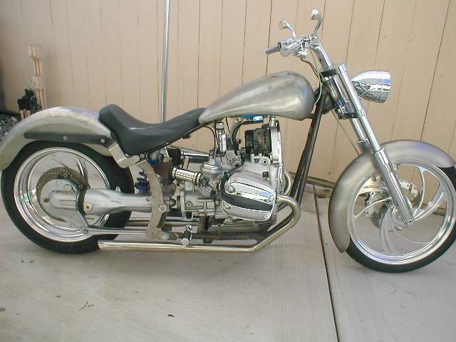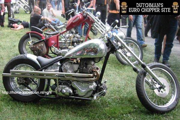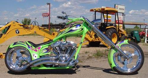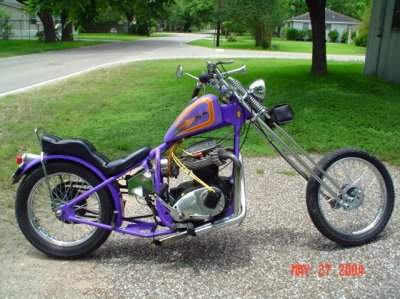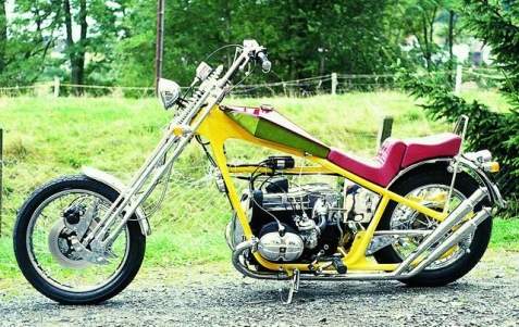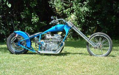 Choppers: derivadas das bobbers e atualmente mais comuns que elas, as choppers se caracterizam pela grande abertuta do ângulo de cáster e por apresentarem as bengalas (suspensões dianteiras) superdimensionadas. O assento do piloto normalmente segue a linha da parte superior do quadro, sendo de reduzidas proporções. Quando existente, o assento da garupa apresenta proporções maiores das encontradas nos das bobbers. Não é raro apresentarem um Santo Antônio (sissy-bar) de grandes proporções, cuja finalidade, além de servir como suporte para o paralama traseiro, é servir como encosto para a garupa, sendo por vezes estofado. As pedaleiras do piloto e respectivos comandos são geralmente muito avançadas, fazendo com que as pernas do piloto fiquem bastante esticadas. Outra característica marcante das choppers é o tanque de combustível de diminutas proporções, instalado sobre a parte superior do quadro (estilo Old School) ou, encobrindo o quadro nos modelos mais recentes. Exitem três modos distintos de se obter uma moto chopper: o primeiro, tradicional, é sua produção a partir de uma outra motocicleta, o segundo é através da aquisição de uma chopper pronta, de fábrica e o último e mais recente modo, é a construção a partir de quadros, tanques de combustível, rodas, motores e outros componentes fornecidos por fabricantes autônomos.